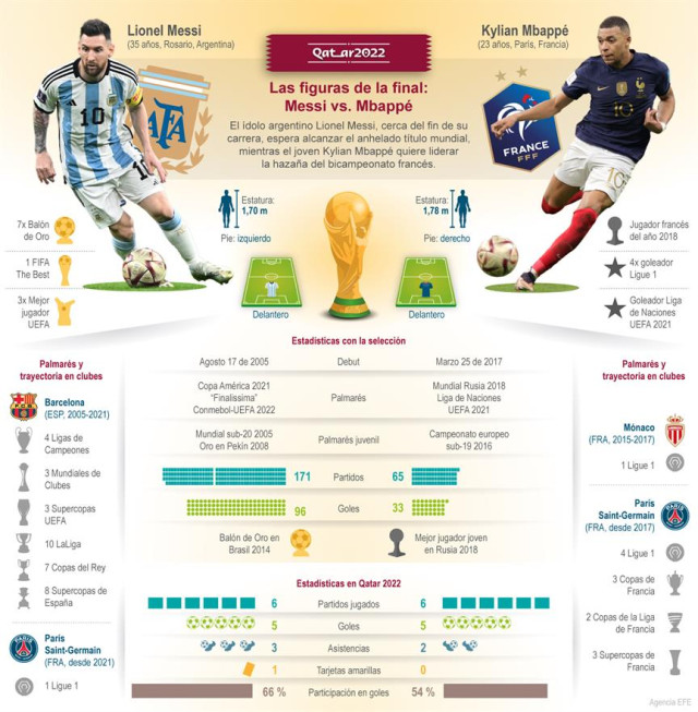 El mundo asiste hoy a un duelo estratosférico, Argentina contra Francia, Lionel Messi contra Kylian Mbappe, la aspiración eterna del '10' Albiceleste de conquistar el Mundial contra la hazaña del 'bleu' de emular a la legendaria Brasil de Pelé con dos títulos consecutivos.