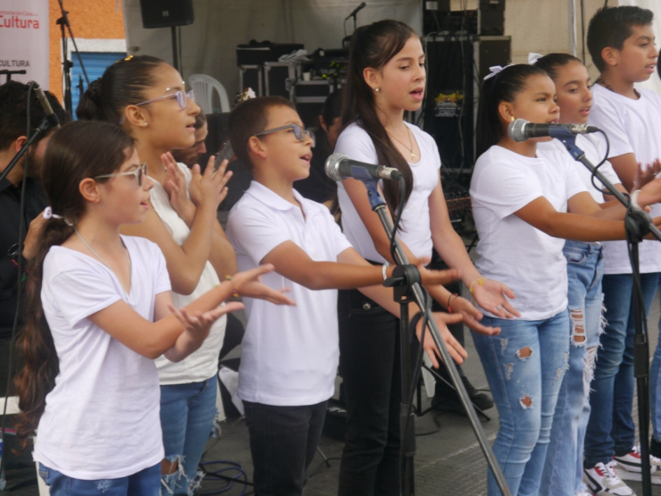 Los Azulejos subieron a la tarima del Parque de Bolívar de Villamaría, para interpretar música colombiana. Son del  coro infantil de la Casa de la Cultura local.